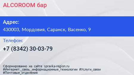 ALCOROOM, бар по адресу 430003, Мордовия, Саранск, Васенко, 9 в дальнейшем Организация, размещена в следующих категориях: