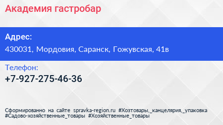 Академия, гастробар по адресу 430031, Мордовия, Саранск, Гожувская, 41в в дальнейшем Организация, размещена в следующих категориях: