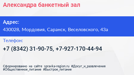 Александра, банкетный зал по адресу 430028, Мордовия, Саранск, Веселовского, 43а в дальнейшем Организация, размещена в следующих категориях: