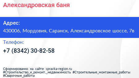 Александровская, баня по адресу 430006, Мордовия, Саранск, Александровское шоссе, 7в в дальнейшем Организация, размещена в следующих категориях: