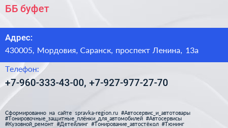 ББ, буфет по адресу 430005, Мордовия, Саранск, проспект Ленина, 13а в дальнейшем Организация, размещена в следующих категориях: