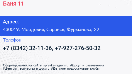Баня №11 по адресу 430019, Мордовия, Саранск, Фурманова, 22 в дальнейшем Организация, размещена в следующих категориях: