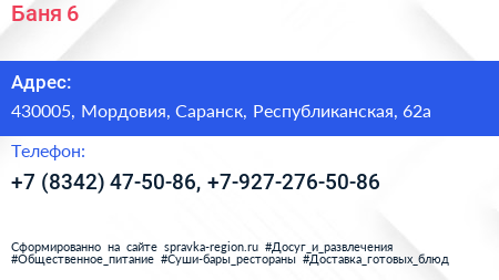 Баня №6 по адресу 430005, Мордовия, Саранск, Республиканская, 62а в дальнейшем Организация, размещена в следующих категориях: