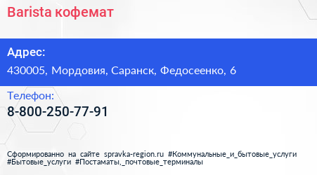 Barista, кофемат по адресу 430005, Мордовия, Саранск, Федосеенко, 6 в дальнейшем Организация, размещена в следующих категориях: