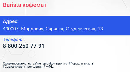Barista, кофемат по адресу 430007, Мордовия, Саранск, Студенческая, 13 в дальнейшем Организация, размещена в следующих категориях: