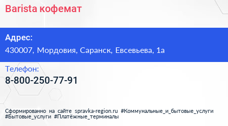 Barista, кофемат по адресу 430007, Мордовия, Саранск, Евсевьева, 1а в дальнейшем Организация, размещена в следующих категориях:
