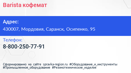 Barista, кофемат по адресу 430007, Мордовия, Саранск, Осипенко, 95 в дальнейшем Организация, размещена в следующих категориях: