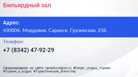 Бильярдный зал по адресу 430004, Мордовия, Саранск, Грузинская, 25Б в дальнейшем Организация, размещена в следующих категориях: