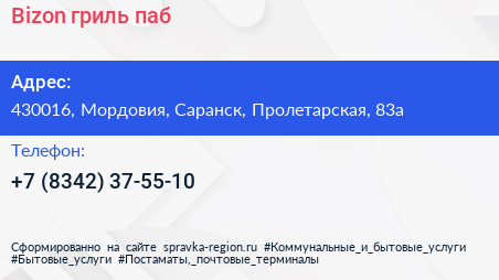 Bizon, гриль-паб по адресу 430016, Мордовия, Саранск, Пролетарская, 83а в дальнейшем Организация, размещена в следующих категориях: