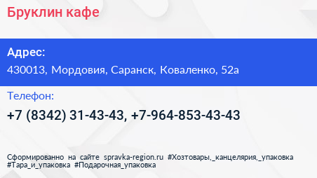 Бруклин, кафе по адресу 430013, Мордовия, Саранск, Коваленко, 52а в дальнейшем Организация, размещена в следующих категориях: