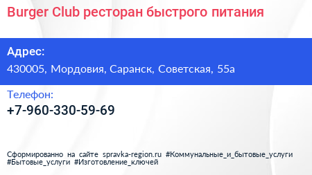 Burger Club, ресторан быстрого питания по адресу 430005, Мордовия, Саранск, Советская, 55а в дальнейшем Организация, размещена в следующих категориях: