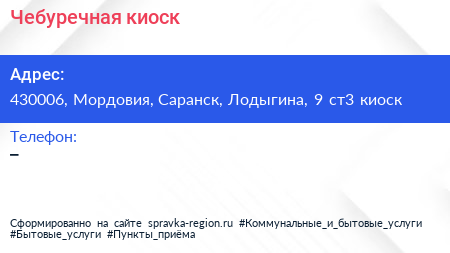 Чебуречная, киоск по адресу 430006, Мордовия, Саранск, Лодыгина, 9 ст3 киоск в дальнейшем Организация, размещена в следующих категориях:
