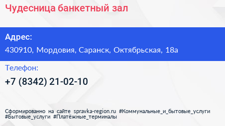 Чудесница, банкетный зал по адресу 430910, Мордовия, Саранск, Октябрьская, 18а в дальнейшем Организация, размещена в следующих категориях: