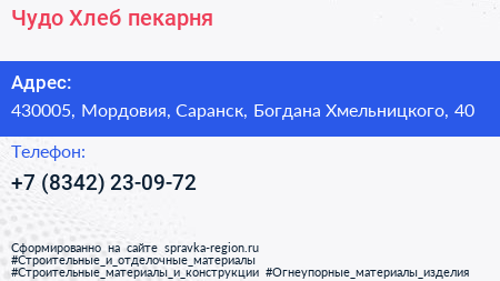 Чудо Хлеб, пекарня по адресу 430005, Мордовия, Саранск, Богдана Хмельницкого, 40 в дальнейшем Организация, размещена в следующих категориях: