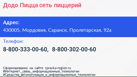Додо Пицца, сеть пиццерий по адресу 430005, Мордовия, Саранск, Пролетарская, 92а в дальнейшем Организация, размещена в следующих категориях: