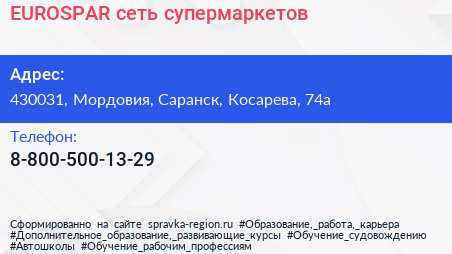 EUROSPAR, сеть супермаркетов по адресу 430031, Мордовия, Саранск, Косарева, 74а в дальнейшем Организация, размещена в следующих категориях: