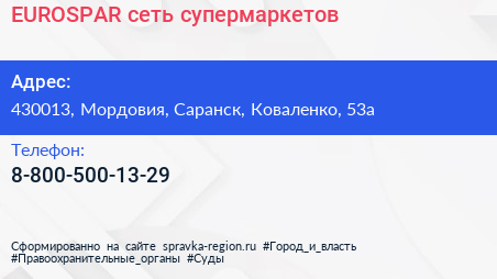 EUROSPAR, сеть супермаркетов по адресу 430013, Мордовия, Саранск, Коваленко, 53а в дальнейшем Организация, размещена в следующих категориях: