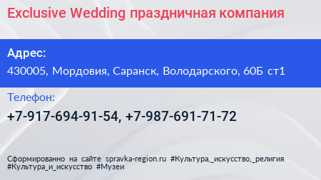 Exclusive Wedding, праздничная компания по адресу 430005, Мордовия, Саранск, Володарского, 60Б ст1 в дальнейшем Организация, размещена в следующих категориях: