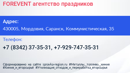 FOREVENT, агентство праздников по адресу 430005, Мордовия, Саранск, Коммунистическая, 35 в дальнейшем Организация, размещена в следующих категориях: