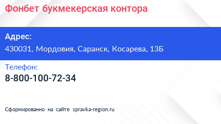 Фонбет, букмекерская контора по адресу 430031, Мордовия, Саранск, Косарева, 13Б в дальнейшем Организация, размещена в следующих категориях: