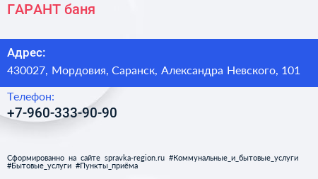 ГАРАНТ, баня по адресу 430027, Мордовия, Саранск, Александра Невского, 101 в дальнейшем Организация, размещена в следующих категориях: