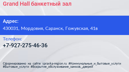 Grand Hall, банкетный зал по адресу 430031, Мордовия, Саранск, Гожувская, 41в в дальнейшем Организация, размещена в следующих категориях: