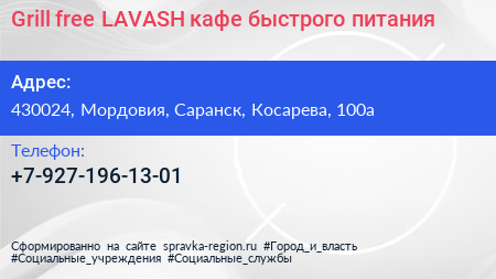 Grill & free LAVASH, кафе быстрого питания по адресу 430024, Мордовия, Саранск, Косарева, 100а в дальнейшем Организация, размещена в следующих категориях: