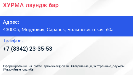 ХУРМА, лаундж-бар по адресу 430005, Мордовия, Саранск, Большевистская, 60а в дальнейшем Организация, размещена в следующих категориях: