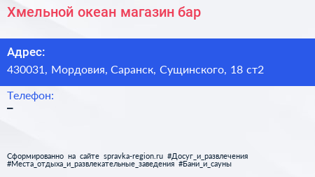 Хмельной океан, магазин-бар по адресу 430031, Мордовия, Саранск, Сущинского, 18 ст2 в дальнейшем Организация, размещена в следующих категориях: