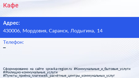 Кафе по адресу 430006, Мордовия, Саранск, Лодыгина, 14 в дальнейшем Организация, размещена в следующих категориях: