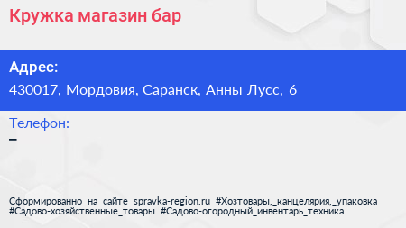 Кружка, магазин-бар по адресу 430017, Мордовия, Саранск, Анны Лусс, 6 в дальнейшем Организация, размещена в следующих категориях: