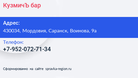 КузмичЪ, бар по адресу 430034, Мордовия, Саранск, Воинова, 9а в дальнейшем Организация, размещена в следующих категориях: