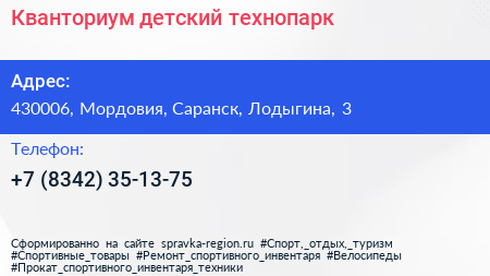 Кванториум, детский технопарк по адресу 430006, Мордовия, Саранск, Лодыгина, 3 в дальнейшем Организация, размещена в следующих категориях: