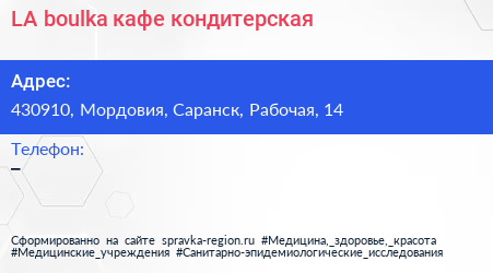 LA boulka, кафе-кондитерская по адресу 430910, Мордовия, Саранск, Рабочая, 14 в дальнейшем Организация, размещена в следующих категориях: