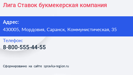 Лига Ставок, букмекерская компания по адресу 430005, Мордовия, Саранск, Коммунистическая, 35 в дальнейшем Организация, размещена в следующих категориях: