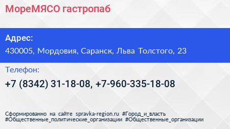 МореМЯСО, гастропаб по адресу 430005, Мордовия, Саранск, Льва Толстого, 23 в дальнейшем Организация, размещена в следующих категориях: