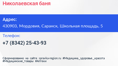 Николаевская баня по адресу 430903, Мордовия, Саранск, Школьная площадь, 5 в дальнейшем Организация, размещена в следующих категориях: