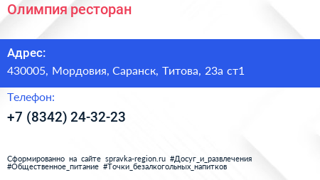 Олимпия, ресторан по адресу 430005, Мордовия, Саранск, Титова, 23а ст1 в дальнейшем Организация, размещена в следующих категориях: