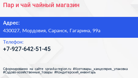 Пар и чай, чайный магазин по адресу 430027, Мордовия, Саранск, Гагарина, 99а в дальнейшем Организация, размещена в следующих категориях: