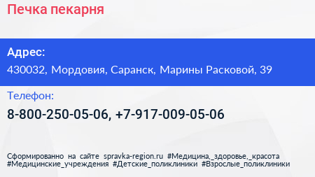 Печка, пекарня по адресу 430032, Мордовия, Саранск, Марины Расковой, 39 в дальнейшем Организация, размещена в следующих категориях: