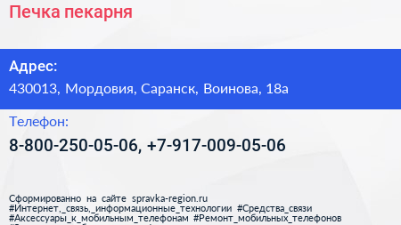 Печка, пекарня по адресу 430013, Мордовия, Саранск, Воинова, 18а в дальнейшем Организация, размещена в следующих категориях: