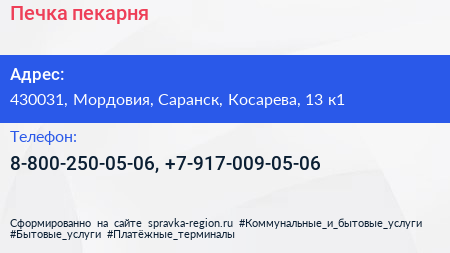 Печка, пекарня по адресу 430031, Мордовия, Саранск, Косарева, 13 к1 в дальнейшем Организация, размещена в следующих категориях: