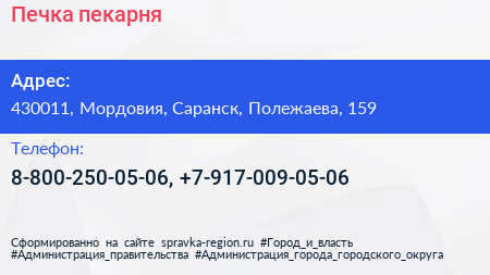 Печка, пекарня по адресу 430011, Мордовия, Саранск, Полежаева, 159 в дальнейшем Организация, размещена в следующих категориях: