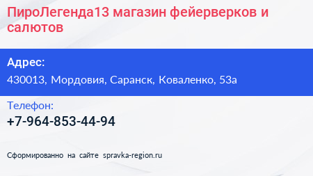 ПироЛегенда13, магазин фейерверков и салютов по адресу 430013, Мордовия, Саранск, Коваленко, 53а в дальнейшем Организация, размещена в следующих категориях: