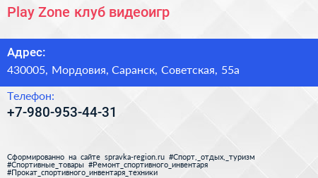 Play Zone, клуб видеоигр по адресу 430005, Мордовия, Саранск, Советская, 55а в дальнейшем Организация, размещена в следующих категориях: