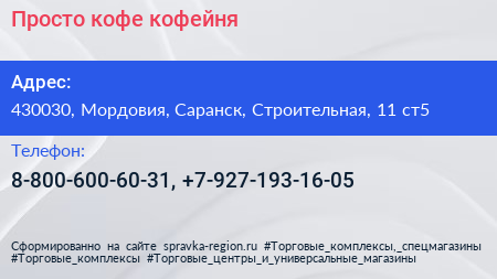 Просто кофе, кофейня по адресу 430030, Мордовия, Саранск, Строительная, 11 ст5 в дальнейшем Организация, размещена в следующих категориях:
