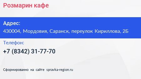 Розмарин, кафе по адресу 430004, Мордовия, Саранск, переулок Кириллова, 2Б в дальнейшем Организация, размещена в следующих категориях: