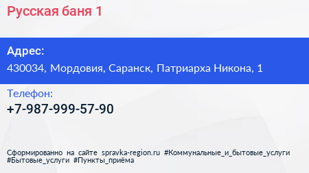 Русская баня №1 по адресу 430034, Мордовия, Саранск, Патриарха Никона, 1 в дальнейшем Организация, размещена в следующих категориях: