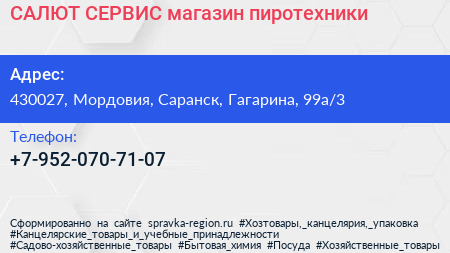 САЛЮТ-СЕРВИС, магазин пиротехники по адресу 430027, Мордовия, Саранск, Гагарина, 99а/3 в дальнейшем Организация, размещена в следующих категориях: