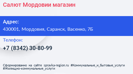 Салют Мордовии, магазин по адресу 430001, Мордовия, Саранск, Васенко, 7Б в дальнейшем Организация, размещена в следующих категориях: